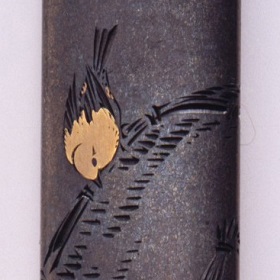 刀の鐔や目貫、小柄などの刀装具は、戦のない平和な江戸時代の間に、多彩な装飾が施されるようになり、美術品としての価値が急速に高まりました。幕末にその技術は頂点を極め、金・銀・赤銅・四分一など種々の金属を高度な彫金技法によって装飾した豪華な刀装具が作られるようになりました。特に京都においては、花鳥風月を細密な彫法によって絵画的に表現した優雅で情趣のある作品が好まれました。