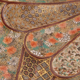 明治期に京都で製作された、薩摩金襴手様式の陶器のことを京薩摩といいます。貫入のある黄みを帯びた素地に、特別に豪華な金彩色絵をほどこした、細やかで華やかな薩摩焼。西洋でSATSUMA と呼ばれたこうした陶器は、幕末・明治の万国博覧会で高い評価を受け、西洋の人々の間で一種のブランドとなっていました。