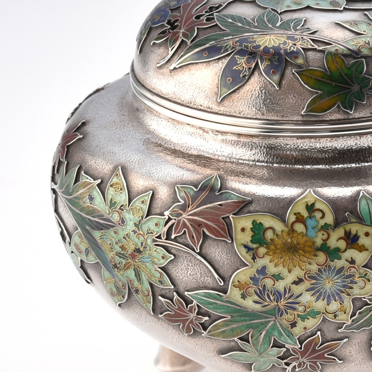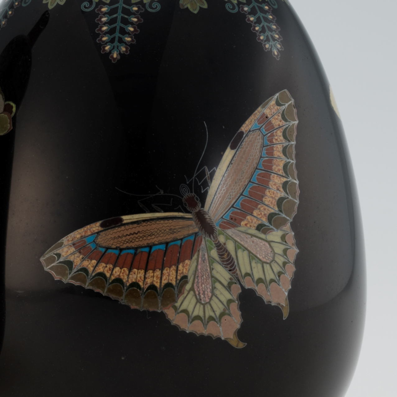 日本の近代七宝は、江戸末期に尾張の梶常吉が有線七宝の技法を解明したことに始まります。のち塚本貝助らによって尾張の産業として発展し、明治になって輸出品として期待されるようになると、京都、東京、横浜などへも生産地が広がっていきました。折しも、博覧会の時代、出品を重ねるごとに技術や意匠が改良され、発色はより多彩で鮮やかに、植線はより精緻に、そして幾何学的な意匠は余白と奥行を持つ絵画的な描写へと変遷していきます。こうして生産技術が最も円熟した明治中期から後期にかけて、日本の七宝は黄金時代を迎えました。当館では、このような時代に作られた優品を中心に収蔵しています。