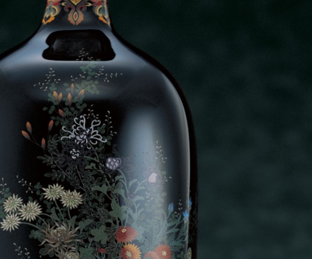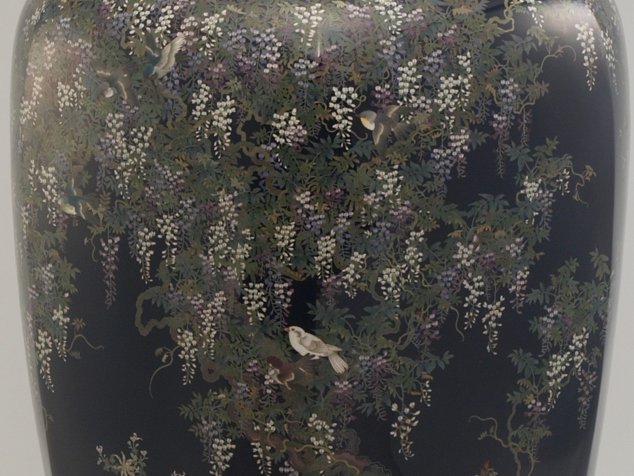 開国後、販路を海外に求めた近代七宝は、万国博覧会へも出品されて高い評価を得ます。需要が拡大するとともに尾張の職人は各地に招聘され、七宝は飛躍的に技術革新を遂げていったのです。当館では、近代七宝の中でも特に明治20年代から大正にかけて、七宝技術が最も円熟した時代に制作された作品を所蔵しています。尾張七宝は、透明感のある茄子紺地を背景に、細緻な金属線と色鮮やかな釉薬で四季折々の花々や鳥たちを情趣豊かに描いた作品が数多くあり、幻想的な魅力をたたえています。